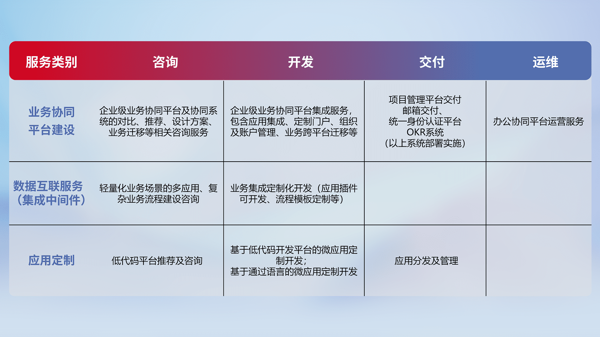针对钉钉、、企微、、、、IDaas等平台级产品提供产品的规划、、、、方案、、、、交付、、、、定制化开发等服务,,,实现如统一协同办公、、智能客户服务、、混合会议管理、、智能数据查询、、、、等业务场景,,,,实现数字化转型。。。
